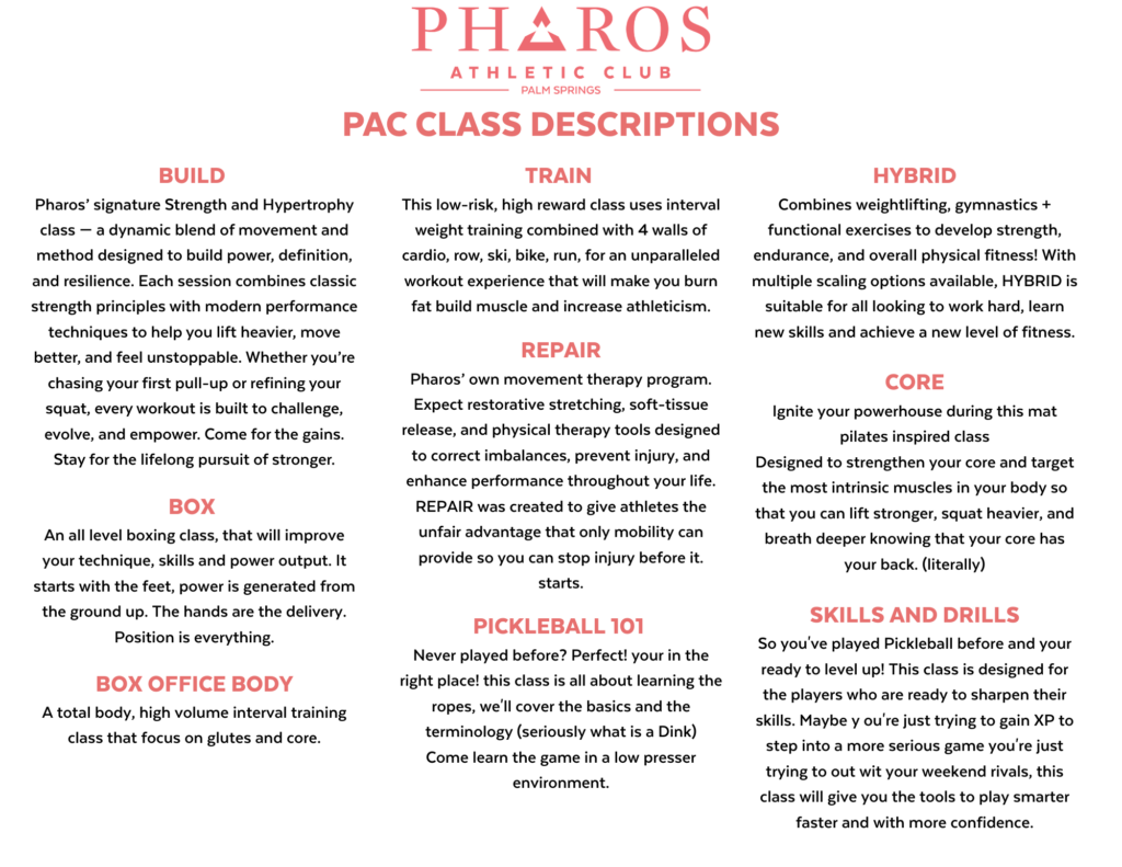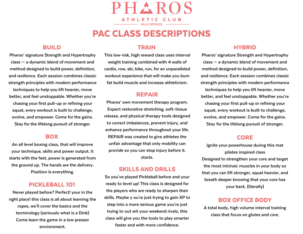 Pharos’ low risk, high reward HIIT style program that uses dumbbells and cardio machines to burn fat, build muscle and increase athleticism. First class at Pharos? This is a great place to start!